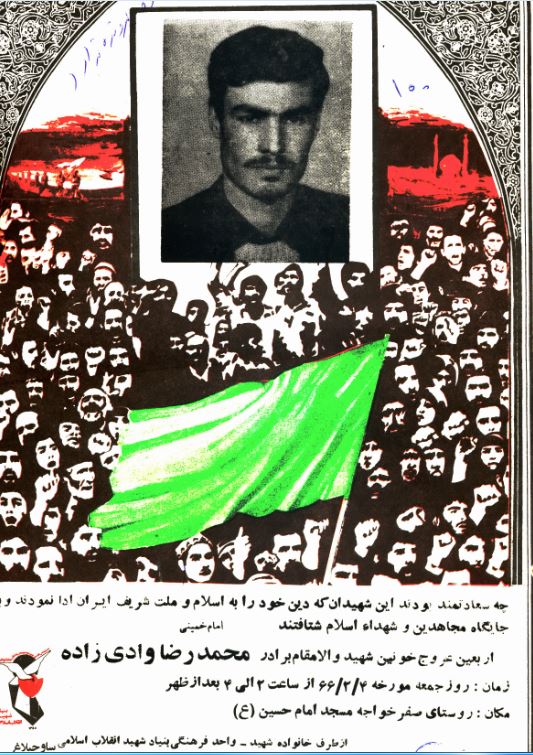 شهید محمد رضا وادی زاده در تاریخ 1/3/42 در یکی از روستاهای ساوجبلاغ(( صفر خواجه ))در یک خانواده مذهبی دیده به جهان گشود و تحصیلات خود را تا فوق دیپلم ادامه داد و معلم آموزش وپرورش بود که این شهید بزرگوار نسبت به انقلاب خیلی فعال بود ایشان هم در مدرسه و هم بیرون از مدرسه فعال بود و چه از نظر فرهنگی و چه از نظر مادی و دینی مثمر ثمر بودند و همه مردم بخصوص جوانها را در کمک کردن به انقلاب اسلامی ارشاد می کردند شهید بزرگوار 4 بار به جبهه اعزام کردید که در آخرین اعزام در تاریخ 19/12/65 در ادامه کربلای 5 در اثر اصابت ترکش به سرو گردن به منطقه شلمچه به درجه رفیع شهادت نائل آمد .