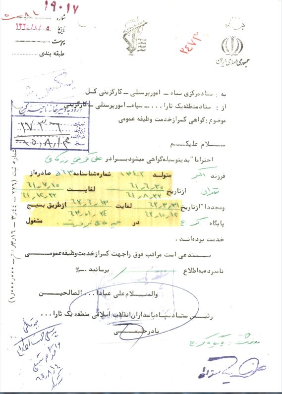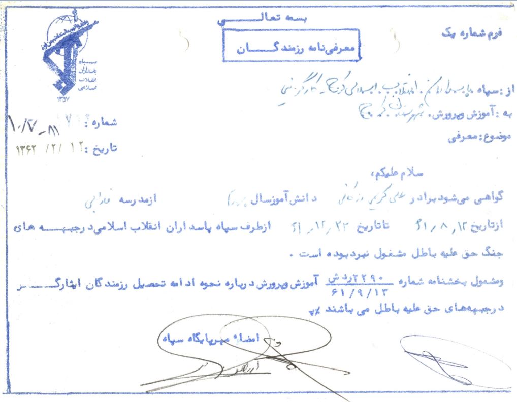 ج) تقریبا شاید بگم یک هفت هشت ده روزی اومد کاغذ را اورد گفتم تو نمی توانی بری جبهه گفت باید بریم بالاخره رضایت دادیم رفت میگم گفتم تو هنوز تفنگ نمی توانی از اینجا برداری بگذاری اونجا گفت حد اقل می توانم آب بدم به رزمنده ها دوبار سه بار هم رفت بار آخر شهید شد