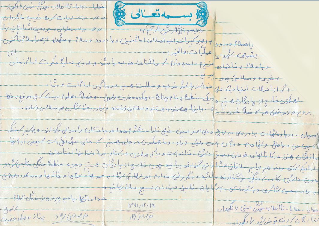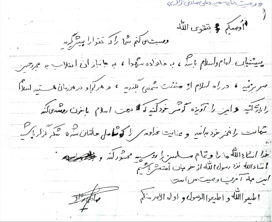 وصیت می کنم شما را که تقوا پیشه کنید. پشتیبان امام و اسلام باشید، به خانواده شهدا، به جانبازان انقلاب و مجروحین سر بزنید و در راه اسلام از منفعت شخصی بگذرید و در هر کجا و در هر زمان هستید، اسلام را یاری کنید و این را آویزه گوش خود کنید که درخت اسلام با خون رشد می کند.