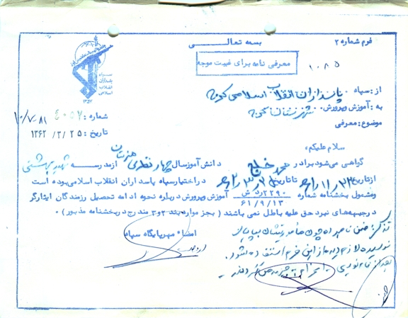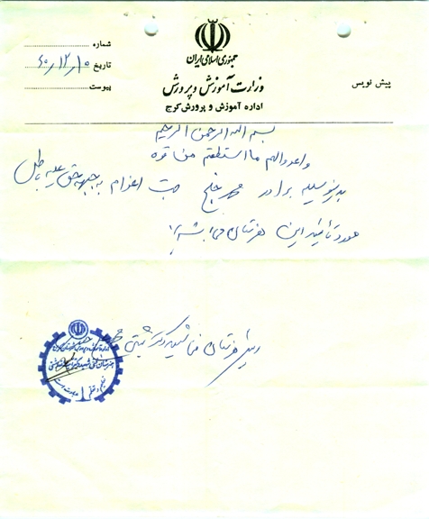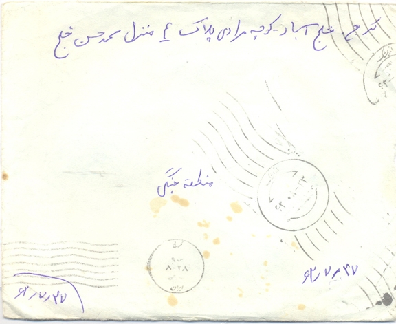 خوب مادرجان من از اینکه تلفن زدهه ام این دومین نامه است که برای شما می نویسم که نامه اول را توسط پست و این نامه را توسط یکی از برادران که می خواست تهران برود بروم که تهران پست کند و امیدوارم که هر چه زودتر بدست شما برسد .مادر جان من خیلی خیلی دلم برای شما و خانواده تنگ شده است و واقعا از دوری شما رنج می برم و براستی مادرجان نمی توانم برای امتحانهای شهریور بیایم ولی برای مرحله مثلا ابان بهمن وغیره می توانم بیایم و امتحان بدهم و امیدوارم که باهم شوم خوب بگذریم راستی الان دلم می خواست بدانم وضع خانواده ؟ است انشااله همگی خوش و خرم باشید وضع حسین اقا چطور است انشا اله خوب است خیلی دلم برایش تنگ شده و می دانید خوب است خصوصا برادرم همچون جمهوری اقا که واقعا ؟هستم و همچنین خواهر هم خیلی خوب است می گویم ارش و زهیر کوچولو سلام برسانید و همگی التماس دعا غمخوار برادر بعد از پدر و مادر خواهری و خواهر مثل مادر می ماند واقعا غمخوار برادر می باشد انهم خواهرانی مثل خانم و فرزانه خانم که واقعا گردن من حق دارند خصوصا زهرا خانم که واقعا خانم است اگر غمری بود از خجالتشان در میادو گرنه حلالم کنید راستی تو ای پدر و مادر مهربانم نمی دانید که چقدر دوستتان دارم و دلم برای شما تنگ شده است واقعا شما برای من خیلی زحمت کشیده اید من که نتوانستم از خجالت شما ها در ایم و از شماها می خواهم که از من راضی و خشنود باشید خوب خیلی سرتان را درد نمی اورم می بخشید و خیلی خوشحال شدم که محمود شیرینی خورده است نمی دانید چه کار دشوار داده است از قول من به او بگو گفت از اول عمرت تا ؟ انجام داده همین است