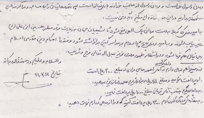 اینجانب از شما انتظار دارم که به مسجد بروید و مبادا خدای نکرده به حرف امام بزرگوارمان گوش فرا ندهید و آنچه می گوید جامه ی عمل نپوشانید، چون فرمان نائب مهدی (عج) فرمان امیرالمومنین علی (ع)، و فرمان علی (ع) فرمان رسول (ص) خداست و فرمان رسول (ص) از جانب خداوند باری تعالی است، پس قدم هایتان را به مساجد و مراکز مذهبی مستحکم تر بردارید. در اینجا با شما وداع می کنم. دیگر عرضی نیست، به امید روزی که کربلا به دست مردان پاک الهی فتح شود تا شیعیان جهان به زیارت مرقد مطهّر حسین بن علی (ع) شرفیاب شوند و به امید روزی که پرچم اسلام بر سراسر گیتی بر افراشته شود و فقط احکام دین مقدّس اسلام بر جهانیان حکمفرما شود و در انتظار ظهور مهدی عزیز (عج). عذر می خواهم بدهی دارم به داماد گرامی ام آقای احمد حاجی مرادی که مبلغ 2000 ریال است به او پرداخت نمایید. مبلغ 250 ریال به برادر عزیزم محمّدرضا زرین بدهید. به داماد دیگرم جناب آقای قربانی 1000 ریال پرداخت نمایید. به مغازه ای که در آن کار می کردم 3000 ریال پرداخت کنید و مرا از بدهی که دارم نجات دهید. والسّلام.