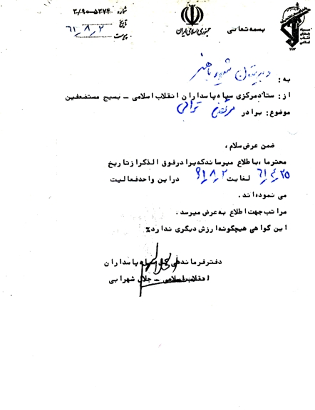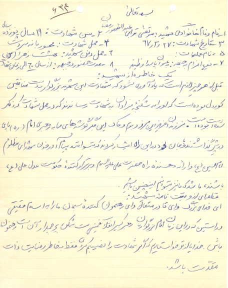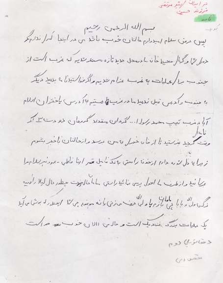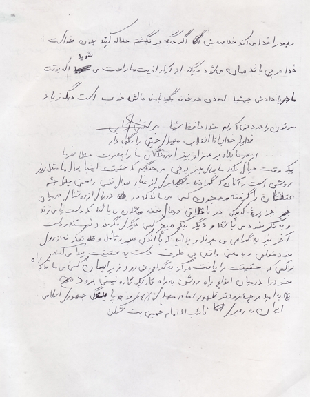 پس از عرض سلام .امیدوارم حالتان خوب باشد.من در اینجا کسری ندارم .مگر دوری شما و گرمای محیط خانه ما در محل جدید تازه مستقر شدیم که غرب است از جنوب برای عملیات به غرب اعزام شدیم و اگر خواستید نامه بدهید .دیگر به جنوب و آدرس قبلی ندهید و ما در غرب هستیم به آدرس باختران . اسلام آباد غرب.تیپ محمد رسول الله . گردان مقداد . گروهان دو . دسته 3.