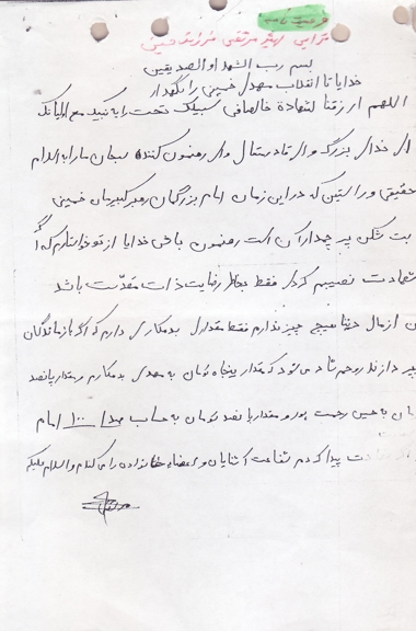اگر نامه ایی وقت کردید بفرستید تا از خانه خبری به من برسد و از حالتان با خبر بشوم. زیرا یه دلشوره دارم و از خونه راستی به فک و فامیل، قمر اینا، فاطی و عمو و غیر سلام مرا برسانید و از طرف ما احوالپرسی نمایید.راستی مامان حال خودت چطوره؟ حال لیلا ، راضیه ، نرگس ، ولی اله و بابا چی؟