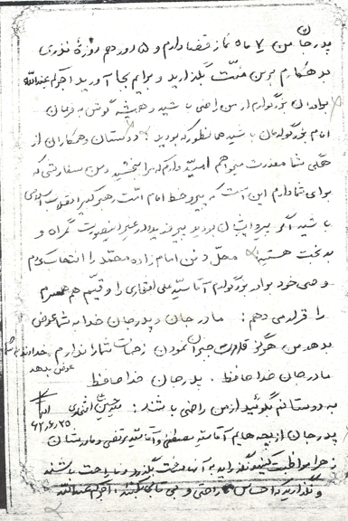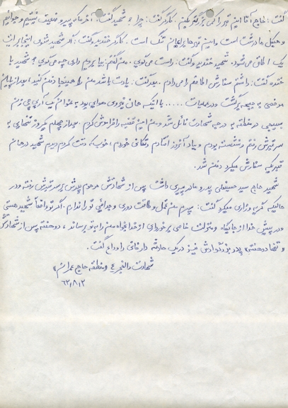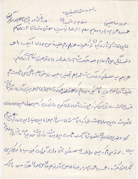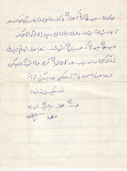 مادرجان و پدرجان! خدا به شما عوض بدهد و من هرگز قدرت جبران نمودن زحمات شما را ندارم. پدرجان! از بچه هایم آقا سید مصطفی و آقا سید مرتضی و مادرشان زهرای عزیز مواظبت کنید و نگذارید به آنها سخت بگذرد و ناراحت باشند و احساس ناراحتی و بیتابی کنند، متشکرم.خداوند به شما عوض بدهد.اجرکم عندالله.