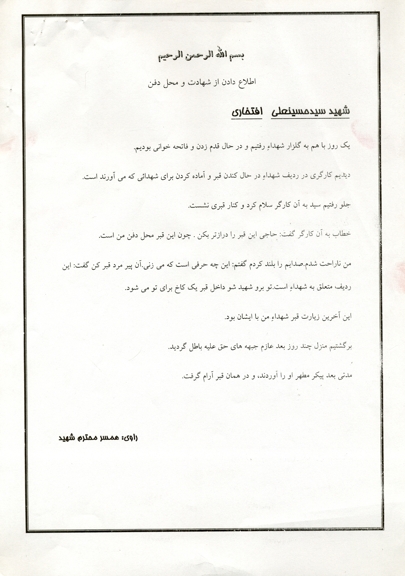 محل دفن امامزاده محمد را انتخاب کردم، وصیّ خود را برادر بزرگوارم آقا سیدعلی افتخاری و قیم هم همسروفادارم را قرار میدهم.