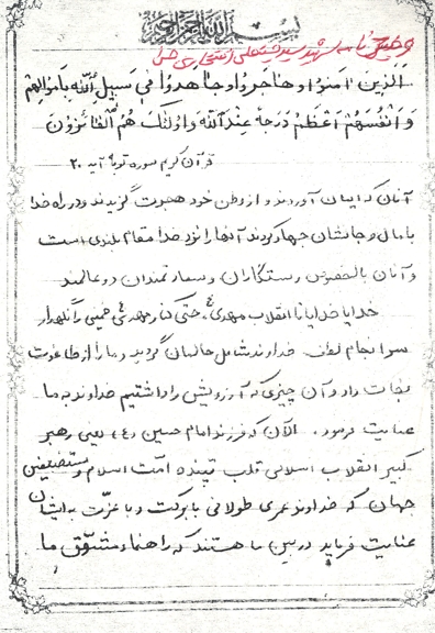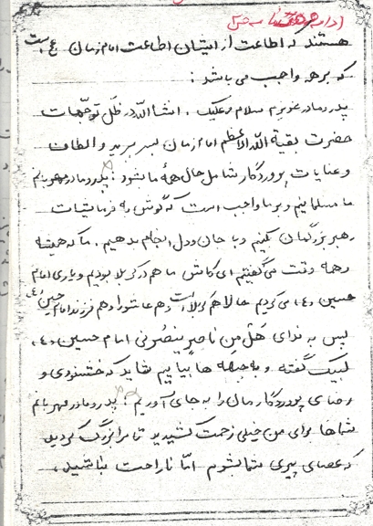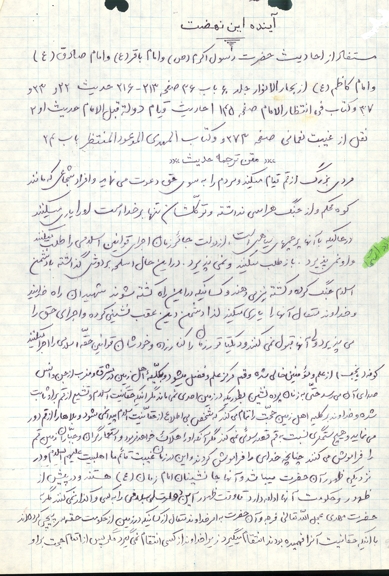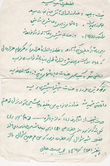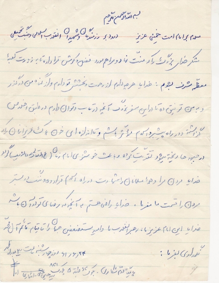 پدرومادرمهربانم! ما مسلمانیم و بر ما واجب است که گوش به فرمایشات رهبر بزرگمان کنیم و با جان و دل فرمانشان را انجام دهیم. ما که همیشه و همه وقت میگفتیم ای کاش ما هم در کربلا بودیم و یاری امام حسین(ع) میکردیم!، حالا هم کربلا است و هم عاشورا و هم فرزند امام حسین(ع)، پس به ندای هل من ناصر ینصرنی امام حسین(ع) لبیک گفته و به جبهه ها بیاییم شاید که خشنودی و رضای پروردگارمان را بجای آوریم.