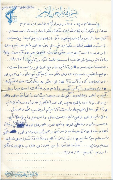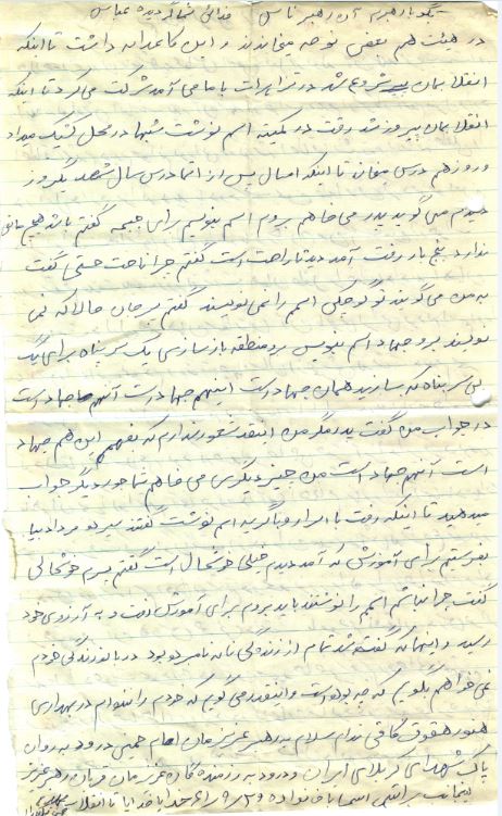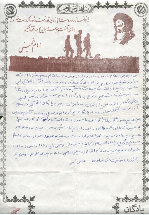 با سلام به پدر و مادر و خواهران و برادران عزیزم سلامتی شما را از درگاه خداوند متعال خواهانم. انشاءالله سلام گرم مرا از این راه دور بپذیرید اگر از حال اینجانب پرسیده باشید به لطف شما بد نیستم. من و مجید با هم هستیم. و حال او خوب است وپسر مشتی قدرت غفاری هم هر یک هفته پهلوی ما می آید وحال او خوب است . نامه شما در تاریخ 1/7/61 بدست من رسید ولی تا این تاریخ نامه مجید هنوز نرسیده است وضع ما خوب است و از همه نظر به ما رسیدگی می شود. انشاءالله در عملیاتی که در آینده آغاز می شود شرکت خواهیم کرد این موضوع را به کسی نگویید. و امام و رزمندگان اسلام را دعا کنید. به احمد و طاهره بگویید که درسهایشان را بخوانند به عمه وعلی پسرعمه و آقای باقری و پسرعمه عبدالعظیم با خانواده سلام برسانید. راستی حال علی چطور است آیا چشم او خوب شد. به حسین و نقی دایی و عمو و یحیی دایی و اسماعیل دایی و سلیمان دایی و حسن دایی و رجبعلی عمو و بمانعلی عمو ومحمدعلی عمو با خانواده وپسرخاله اعلا و خاله و شوهرخاله و مرتضی و جمشید و جواد و محمود و همگی را سلام برسانید و از قول من به کلیه دوستان و آشنایان و فامیلها سلام برسانید . خداحافظ شما به امید پیروزی حق بر باطل و رزمندگان اسلام .