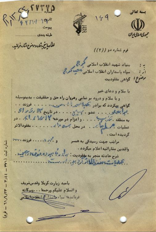 با درود بر پیغمبر اسلام و امامان علیهم السّلام و با سلام به امام زمان (عج) و نایب بر حقّش امام خمینی و با سلام به پدر و مادر و برادران و خواهرانم. از شما می خواهم که همانگونه که من در جبهه برای خدا و شما خدمت می کنم، شما هم در پشت جبهه برای خدا کار کنید و به سخنان امام گوش کنید و پاسدار انقلاب باشید و إن شاءالله که همه با هم منّور به نور خدا شویم و دشمنان اسلام را شکست دهیم و ضربه ی نهایی را بر صدّام وارد کنیم و دین اسلام و انقلاب را به تمام جهان صادرنماییم. تا فرصت هست توبه نمایید. از همه ی فامیل و دوستان و آشنایان حلالیّت می طلبم خدا نگهدار.