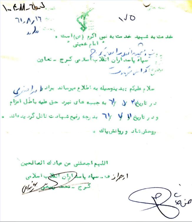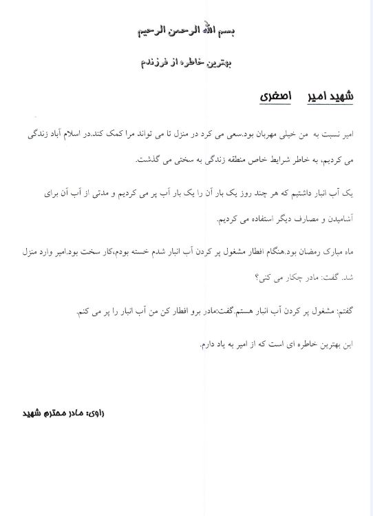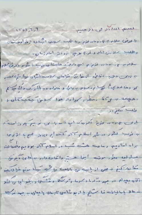 باعرض سلام به پدرومادر عزیز وبا طلب سلامتی ایشان از خداوند متعال وطلب سلامتی امام وفرج هرچه زودتر امام زمان .سلام بر پدرومادر عزیزم امیدوارم که حالتان خوب باشد وبا عرض سلام به زری وحمید وفاطمه از خدا نیز خواهان سلامت ایشان می باشم سلام به عمو خاله وبچهها می رسانم سلام به دائی وخانواده وبه بابابزرگ وننه می رسانم و همچنین به محمدآقا ومنظر وسمیرا واز خدا سلامتی یک یک آنان را طلب می کنم. باری پدرومادر عزیز اکنون که این نامه را می نویسم یک روز است که به غرب کشور در شهر اسلامآباد آمده ایم دیروز صبح با اتوبوس براه افتادیم و ساعت هشت شب در اسلامآباد بودیم وطبق گفته مسئولین بطور موقت اینجا هستیم وامکان دارد به جای دیگر نقل مکان کنیم در ضمن از بابت من ناراحت نباشید یک موقع خیال نکنید الآن بچهام در جبهه در گرما وسرما وگرسنگی وتشنگی وبیخوابی می کشد نه حالا یا ما لیاقت نداشتیم یا از بدشانسی تابه حال پایمان به جبهه نرسیده مگر موقعی که عملیاتی شروع شود در واقع دراینجا میخوریم ومیخوابیم وکار سختی نداریم و به ما خوش می گذرد در ضمن در طی این مدت که در جنوب بودیم نامهای به ما نرسیده این را ازاین جهت گفتم که اگر نامهای نوشته اید بدانید به دست ما نرسیده وشاید از آنجا بای ما نفرستادند . درضمن اگر حسن را دیدید سلام مرا به او برسانید وبه او بگوئید که از دور اورا می بوسم وهر لحظه در یاد او هستم و از خدا آرزو می کنم که هر چه زودتر اگه امکان دارد او را نیز به نزد ما بفرستد تا بتوانیم در نزدیک یکدیگر با دشمنان بعثی نبرد نمائیم خلاصه اگر مانعی وجود ندارد از وضع حال خود وحسن برایم بنویسید که کجا رفته وآیا اعزام شده است یانه وبه کدام جبهه اعزام شده خلاصه اخبار کاملی از او برایم بنویسید .خلاصه دیگر سخنی ندارم جز سلامتی شما وسلامتی رهبر انقلاب امام خمینی ودر ضمن به بچههای انجمن اسلامی نیز سلام برسانید به جعفر وعلی وخلاصه تمام آنها .