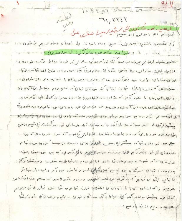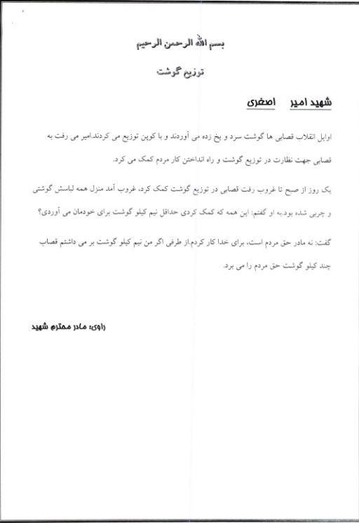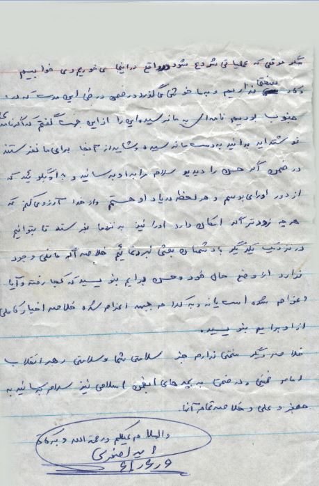 پدرو مادر و شما ای بستگان من شاید اکنون که این نامه را می خوانید من دیگر در این دیار نباشم بنابر این از شما می خواهم که در مرگ من غصه نخورید و بخود بقبولانید که اسلام حق اختصاص هر چیز را که انسان ان رادارد به وی نمی دهد پس فرزند شما هم به شما تعلق ندارد