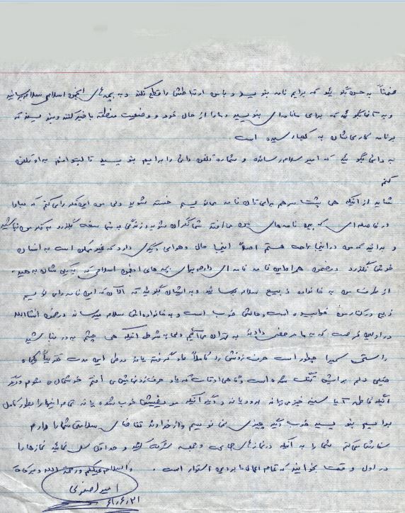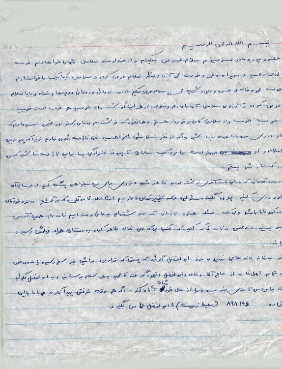 حضور پدرومادر عزیز سلام عرض می کنم واز خداوند سلامتی شمارا خواهانم خدمت زری وحمید وسمیرا وفاطمه و خدمت محمدآقا ومنظر سلام عرض کرده وسلامتی یکایک را خواستارم خدمت عمو وخاله وحسن وعلی وشیرین محسن سلام عرض می کنم از دور به دائی وزندانی وبچهها وننه وبابا سلام عرض کرده وآرزوی سلامتی آنها را دارم وخلاصه از همه اینها گذشته حال خود من هم خوب است خوبِ خوبِ خوب واز سلامتی کامل برخوردار هستم و همانطور که نوشتهام به ما می رسند درضمن امیدوارم که از دوری من ناراحت نباشید واگر از نظر اسلامیش را بخواهید حق ناراحت شدن ندارید زیرا که پیوند بین اسلام واو مهمتر است برای یک مسلمان تا پیوند خانوادگی بنابر این ناراحت نباشید که من در کنار شما نیستم .