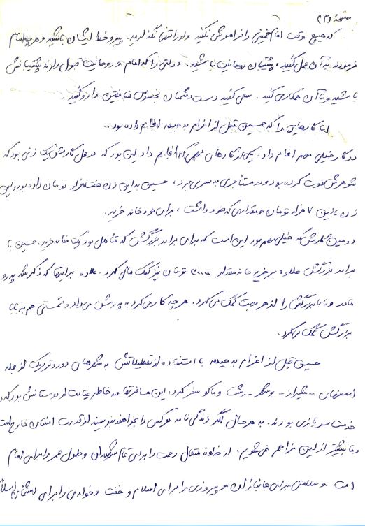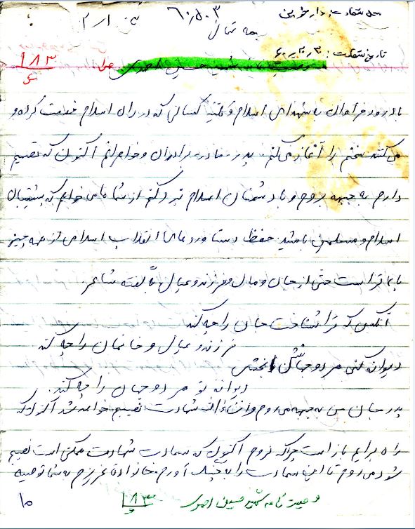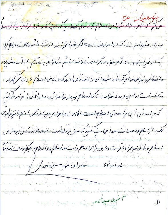 پدر جان! من به جبهه مى روم و إن شاءالله شهادت نصیبم خواهد شد. اکنون که راه برایم باز است چرا که نروم. اکنون که سعادت شهادت ممکن است نصیبم شود، می روم تا این سعادت را به چنگ آورم. خانواده ی عزیزم! به شما توصیه مى کنم که نام و راه شهداى اسلام را زنده نگهدارید که اینکار براى بقاى اسلام بسیار مفید است. که در این صورت اگر خدا بخواهد از شما شفاعت خواهم کرد. از امّت شهید پرور انقلابى نیز مى خواهم که راه شهیدان را زنده نگهدارند که دنیاى اسلام با دنیاى کفر در مقابله است و این وعده ی خداست که اسلام پیروز خواهد شد. مبادا آنها را فراموش کنید که فراموشى آنها فراموشى اسلام است. اطاعت و اجراى پیام هاى امام را فراموش نکنید و از امام و روحانیّت جدّا حمایت کنید. از خداوند متعال پیروزى اسلام و طول عمر براى امام امّت را خواهانم. والسّلام علیکم و رحمه الله و برکاته.