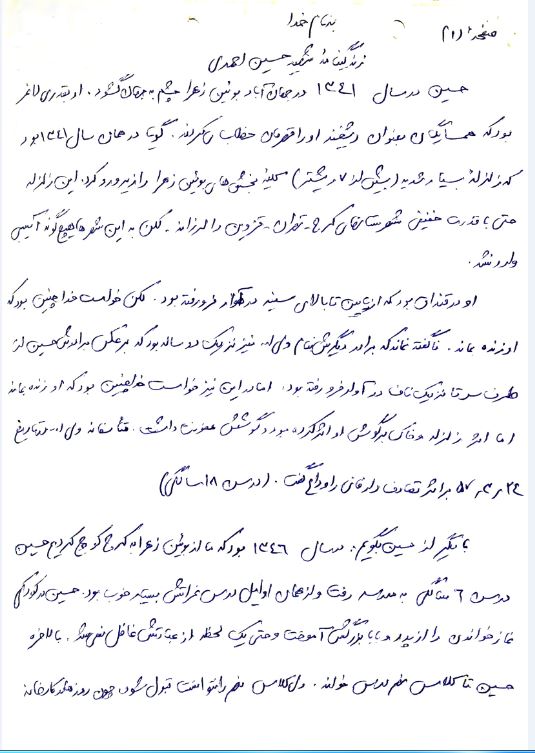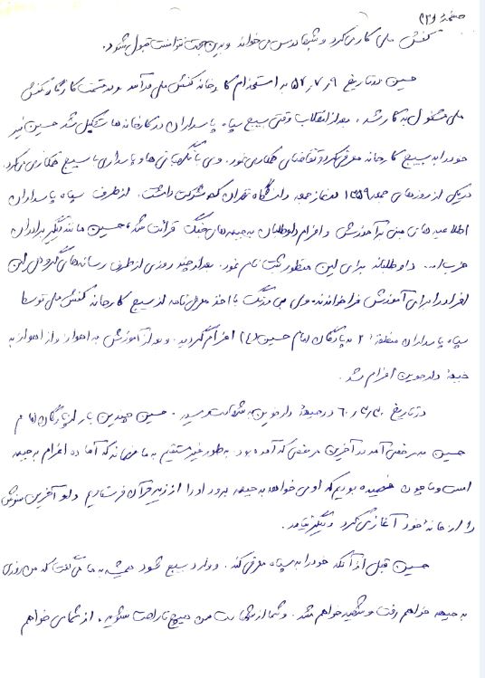 با درود فراوان به شهداى اسلام و کلیّه ی کسانی که در راه اسلام خدمت کرده و مى کنند. سخنم را آغاز مى کنم. پدر و مادر و برادران و خواهرانم! اکنون که تصمیم دارم به جبهه بروم و با دشمنان اسلام نبرد کنم، از شما مى خواهم که پشتیبان اسلام و مسلمین باشید. حفظ دستاوردهاى انقلاب اسلامى از همه چیز بالاتر است. حتّى از جان و مال و فرزند و عیال. و به مصداق حدیث قدسى : مولانا جلال الدّین محمّد بلخی