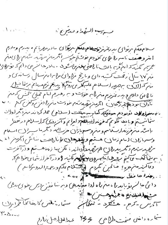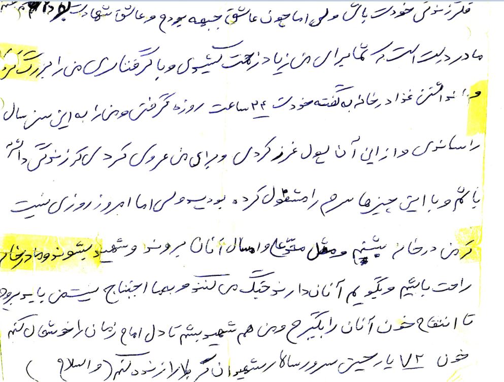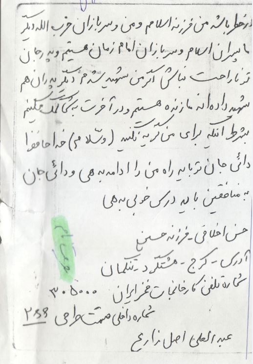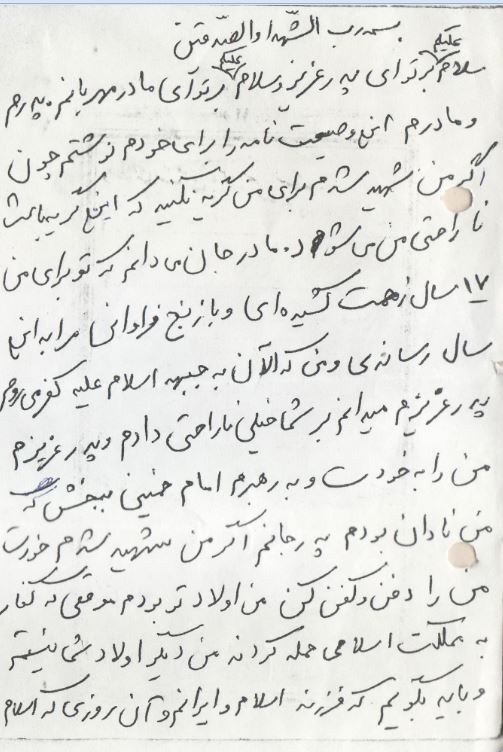 پدرم و مادرم! این وصیّت نامه را برای خودم نوشتم، چون اگر شهید شدم برای من گریه نکنید که این گریه باعث ناراحتی ام می شود. مادر جان! می دانم که تو برای من 17 سال زحمت کشیده ای و با رنج فراوانی مرا به این سن و سال رساندی. پدر عزیزم! می دانم به شما خیلی ناراحتی دادم مرا به خودت و به رهبرم امام خمینی ببخش که من نادان بودم. پدر جانم اگر من شهید شدم خودت مرا دفن و کفن کن. من اولاد تو بودم هنگامی که کفّر به مملکت اسلامی حمله کردند. من دیگر اولاد شما نیستم و باید بگویم که فرزند اسلام و ایرانم و آن روزی که اسلام در خطر باشد من فرزند اسلامم و من و سربازان حزب الله دیگر پسران اسلام و سربازان امام زمان (عج) هستیم. پدرجان! تو ناراحت نباش اگر من شهید شدم دیگر پدران هم شهید داده اند، ما زنده هستیم و در آخرت به شما کمک می کنیم بشرط اینکه برای من گریه نکنید. دایی جان! تو باید راه من را ادامه بدهی و به منافقین باید درس خوبی بدهی. والسّلام و خداحافظ.