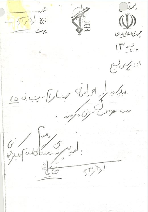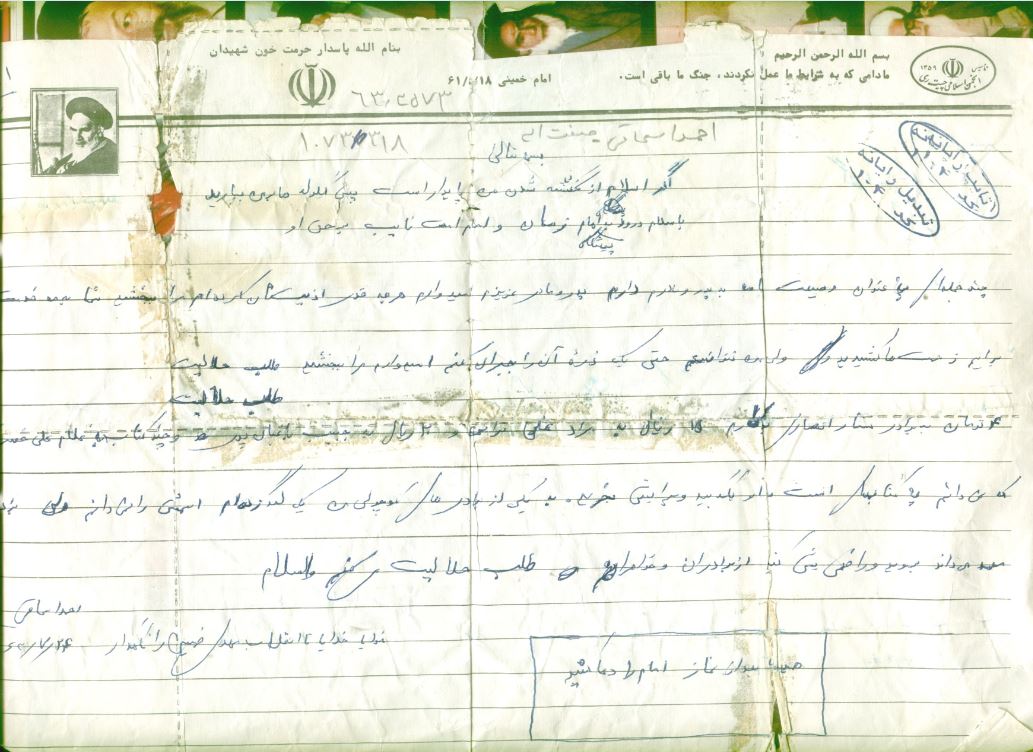 اگر اسلام از کشته شدن من پایدار است پس گلوله ها بر من ببارید. با سلام و درود به پیشگاه امام زمان (عج) و امام امّت نایب بر حقّ او، چند جمله ای به عنوان وصیّت نامه به پدر و مادرم دارم. پدر و مادر عزیزم! امیدوارم که هر چقدر اذیّتتان کرده ام مرا ببخشید، شما به من خدمت ها کردید و برایم زحمت ها کشیدید ولی من نتوانستم حتّی ذرّه ای از آن را جبران کنم امیدوارم ببخشید. چهار تومان به برادر ستّار انصاری بدهکارم، پانزده ریال به مراد علی ترابی، بیست ریال به حبیب باغبان پری و چند کتاب به غلامعلی خسروی که نمی دانم چه کتابهایی است به او بگویید و برایش بخرید. به یکی از برادرهای کوچولویی من یک لگد زدم اسمش را نمی دانم ولی برادر رسول علی پدر نور محمّد می داند بروید و راضی اش کنید. از برادران و خواهرانم طلب حلالیّت می کنم. همیشه بعد از نماز امام را دعا کنید. خدایا خدایا تا انقلاب مهدی خمینی را نگهدار. والسّلام.