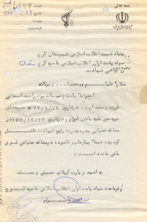 - سپاه.. سپاه مارو دعوت کرد؛ سپاه مارو دعوت کرد پیکرارو تمیز گذاشته بودند پیش هم بودن اینا. دوباره سپاه و آقای شجاعی و اینا دوباره برگشتیم احمد اسحاقیه. در تابوت رو باز کردند. در تابوت رو باز کردند؛ استخوان و اینا بودو جالب این بود که لبساش که روش بود خونش تازه بود. فقط این واسه من خیلی جالب بود. آخه این چجوریه که بعد از 18 سال لباساش خون چرا تازس
