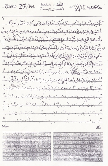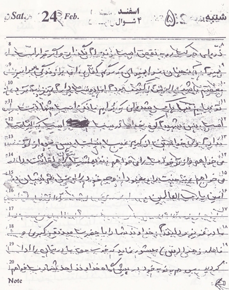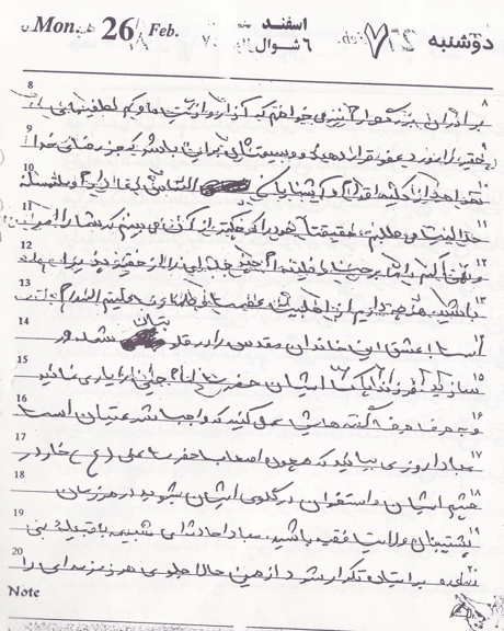 میدانم که خیلی اذیّتان کردم امّا عاجزانه تقاضا دارم که عفوم نمایید و برایم دعا کنید. همچنین از برادران بزرگوارم نیز می خواهم که آزار واذیّت ها وکم لطفی های حقیر را مورد عفو قرار دهید. از کلیّه ی اقوام و آشنایان التماس دعا دارم و ملتمسانه حلالیّت می طلبم. درهر زمان پشتیبان ولایت فقیه باشید. خانواده های شهدارا خیلی احترام بگذارید. همچنین بسیجیها را که شهدای آینده از میان آن ها یافت میشود را احترام کنید. از خدا بخواهید توفیق علم وعمل به وظیفه را نصیبشان کند. حقیر را خیلی دعا کنید که واقعا محتاجم و از ته قلب حلالم کنید. والسّلام علیکم و رحمه الله و برکاته