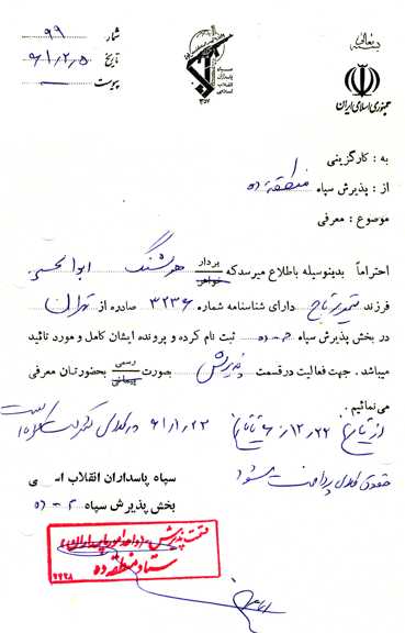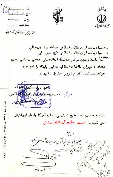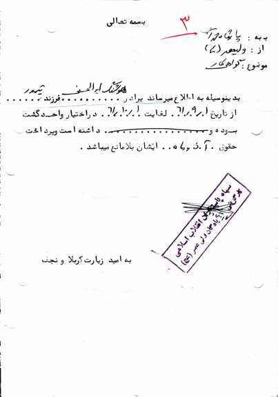با سلام به آنکه بیشتر از جان دوستش دارم، همان آزاد کننده انسان ها پیر جماران بت شکن زمان امام خمینى(ره) کبیر. و با سلام به امت مسلمان مبارز که کمر یزیدیان زمان را شکستند و سلام به مادر و پدر و برادر و خواهرانم که هر چه هستم از آنجا برخاسته ام.