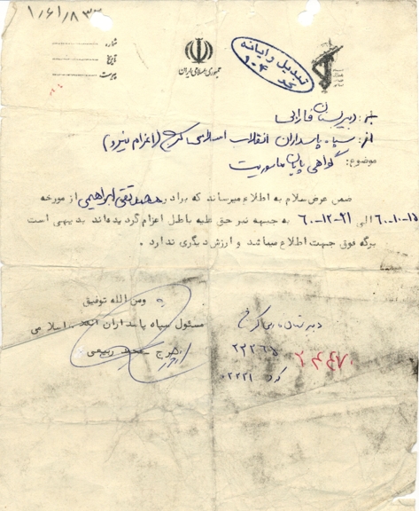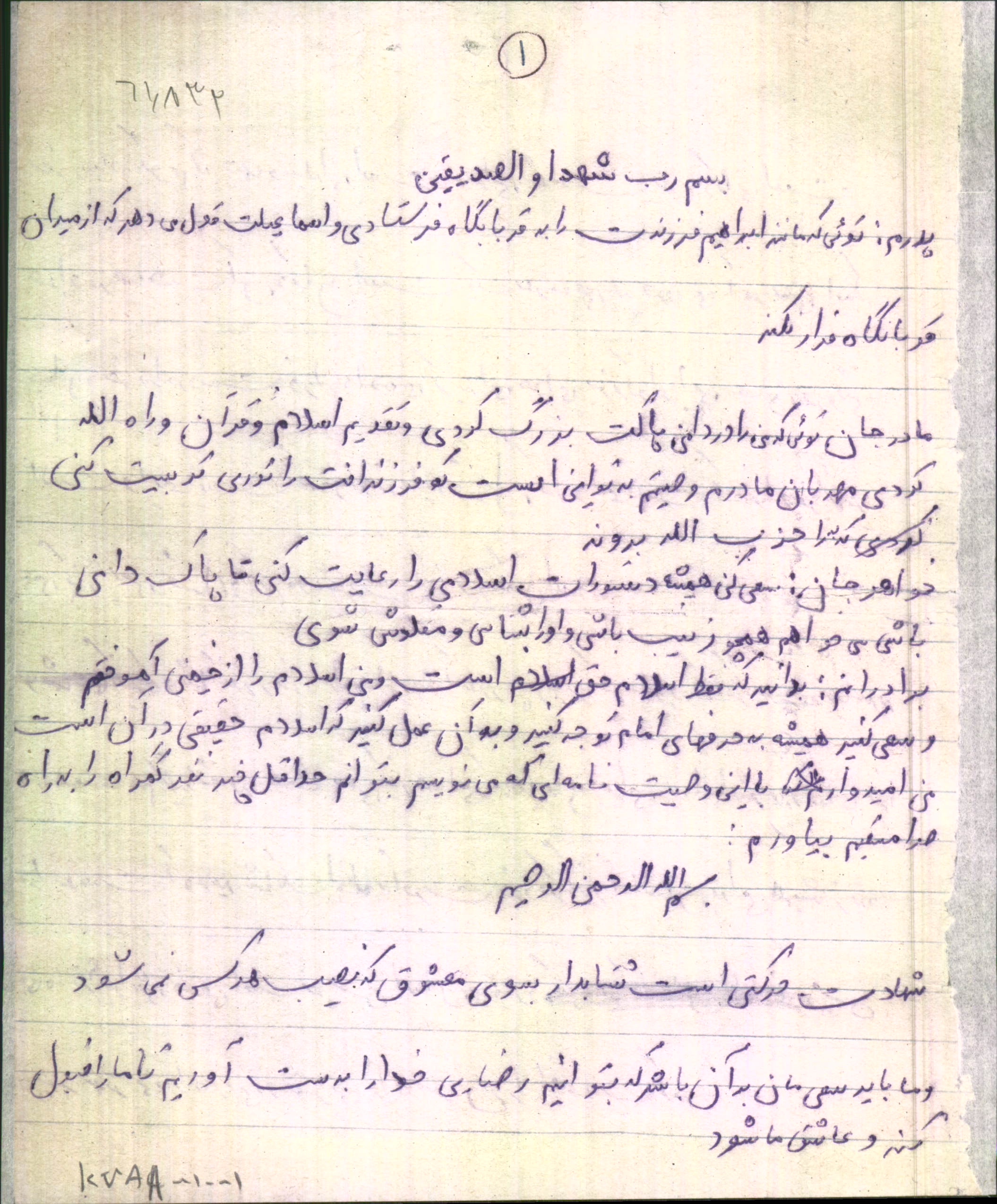 با سلام و درود بر خون پاک شهیدان انقلاب اسلامی و خمینی بت شکن با سلام و درخواست سلامتی شما از درگاه خداوند امیدوارم که سلامت و شاداب باشید نگرانی ما از طرف شماست اینجا هیچ نگرانی نیست به یکایک شما سلام می رسانم و سلامتی شما را از درگاه خداوند خواستارم سلام بر مادرم و امیدوارم که حالت خوب باشد و از طرف من غم مخوری سلام بر پدرم امیدوارم خوشحال و شاداب باشد سلام بر برادرانم فرهاد , جبرئیل, محمد رضا, و رسول و رحیم سلامتی شما را از درگاه خدا خواستارم و سلام بر خواهرم فاطمه امیدوارم که سلامت و خرم باشی ما اکنون در اسلام آباد کرمانشاه هستیم و امروز به جبهه اعزام هستیم .و السلام .