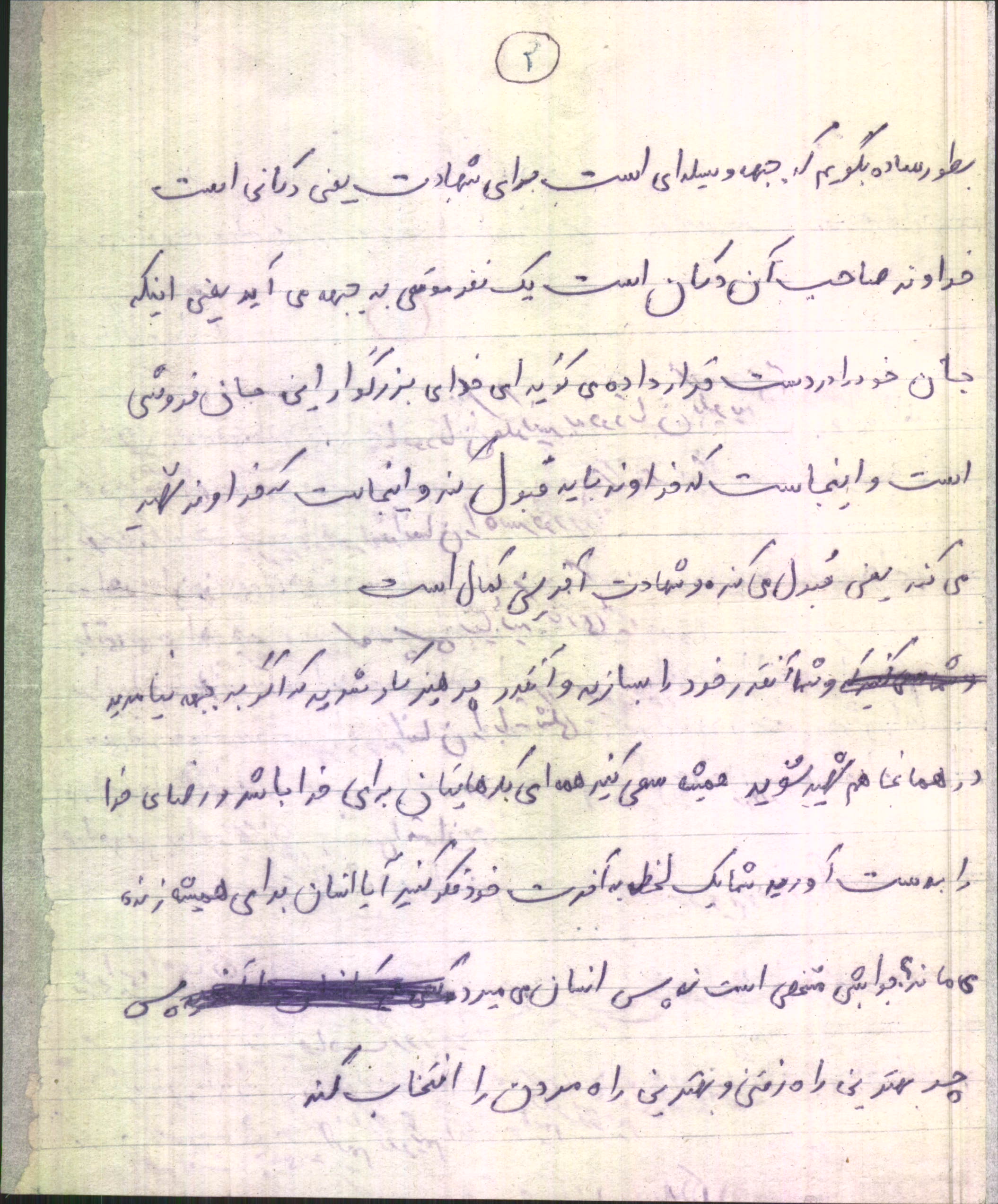 پدرم! تویی که مانند ابراهیم فرزندت را به قربانگاه فرستادی و اسماعیلت قول می دهد که از میدان قربانگاه فرار نکند. مادرجان! تویی که من را در دامن پاکت بزرگ کردی و تقدیم اسلام و قرآن و راه الله کردی. مهربان مادرم! وصیّتم به تو این است که فرزندانت را طوری تربیت کنی که بسوی حزب الله بروند. خواهرجان! سعی کن همیشه دستورات اسلامی را رعایت کنی تا پاک دامن بمانی، می خواهم همچون زینب (س) باشی و او را بشناسی. برادرانم! بدانید که فقط اسلام حق اسلام است و من اسلام را از خمینی آموختم. سعی کنید همیشه به حرف های امام توجّه و بدان عمل کنید که اسلام حقیقی در آن است. من امیدوارم با این وصیّت نامه ای که می نویسم بتوانم حداقل چند نفر گمراه را به راه مستقیم بیاورم. شهادت حرکتی است شتابدار بسوی معشوق که نصیب هر کس نمی شود، ما باید سعی مان برآن باشد که بتوانیم رضای خدا را بدست آوریم تا ما را قبول کرده و عاشق ما شود. به طور ساده بگویم که جبهه وسیله ای است برای شهادت یعنی دکّانی است که خداوند صاحب آن است یک نفر مو قعی به جبهه می آید یعنی اینکه جان خودش را در دست قرار داده و می گوید ای خدای بزرگوار! این جان فروشی است و اینجاست که خداوند باید قبول کند. اینجاست که خداوند شهید می کند یعنی قبول می کند و شهادت آخرین درجه ی کما ل است. و شما آنقدر خود را بسازید و آنقدر پرهیزکار شوید که اگر به جبهه نیامدید در همانجا هم شهید شوید. همیشه سعی کنید همه ی کارهایتان برای خدا باشد و رضای خدا را بدست آورید. شما یک لحظه به آخرت خود فکر کنید آیا انسان برای همیشه زنده می ماند؟ جوابش مشخص است، نه! پس انسان می میرد پس چه بهترین راه رفتنی و بهترین راه مردن را که شهادت است انتخاب کند. و یک بار دیگر به آخرت فکر کنید با خودتان فکر کنید به خودتان بگویید که آیا خداوند شما را آفرید برای چه؟ آیا خداوند انسان را سرخود رها می کند فکر نمی کنید در آخر هر کاری باید امتحان بدهید؟ پس بیایید کاری کنیم در این امتحانی که خداوند می گیرد قبول شویم. گاهی خداوند انسان را تشنگی، گاهی گرسنگی، گاهی در سختی زندگی، گاهی در جهاد و گاهی در نفس امتحان می کند. در داخل خودتان بروید آیا ببینید می توانید دراین امتحان قبول شوید؟ فکر کنید بگویید موقعی که ما مُردیم و رفتیم در روز آخرت به مالک یوم الدین به صاحب روز قیامت و آخرت چه جوابی خواهیم داد؟ و چه خواهیم گفت؟ چه می توانیم بگوییم؟ آیا می توانیم بگوییم خداوندا تو مرا آفریدی ولی من در آن دنیا جز گناه کاری دیگری نکردم!؟ یا اینکه با سربلندی و افتخار بگوییم در راه تو جان دادم و در آن دنیا هم بالاتر از جان چیز دیگری نبود بشما بدهم و در برابر خداوند روسفید باشیم. پس بیایید کاری کنیم که درآخرت با سربلندی و افتخار جواب دهیم و در برابر خداوند روسفید باشیم. و من از همه می خواهم که به ریسمان خدا چنگ زنید و از تفرقه بپرهیزید و گرنه مدیون خون شهدایید و آنچنان بر سر شما خواهد آمد که یزیدیان به شما حاکم باشند. ای منافقین و سنگ اندازان بین راه انقلاب، آیا هزاران هشدار و کرامت و معجزه در این انقلاب شما را هوشیار نکرده؟ تا کی می خواهید رذالت کنید و از امام و اسلام محروم باشید؟ سعی کنید و به سیل خروشان انقلاب بپیوندید و اِلّا ترازوی عدل الهی و عذاب دوزخ در انتظارتان می باشد. و چگونه می خواهید درآخرت به خداوند جواب دهید! شرم کنید آنقدر شهید دادیم اینقدر خون دادیم باز حیا نمی کنید! باز می خواهید زیر سلطه باشید! یا خودتان می خواهید سلطه باشید. بیایید بخاطر احترام به خون این شهیدان هم که شده توبه کنیم و به خدا بگوییم توبه از من و بخشیدن از تو. و آنقدر به این امّت و به انقلاب و اسلام و به امام خیانت نکنیم و توبه کنیم که خداوند توبه پذیر است. همانا که امام باقر (ع) می فرمایند: آن کسی که از گناه خویش توبه کند مانند کسی است که گناه نکرده باشد امّا آن کسی که استغفار کند ولی باز هم ازگناه خود دست برندارد همانند کسی است که خود را مسخره کند. و خداوند در جای دیگری می فرماید هر کس پ