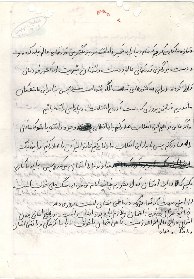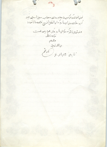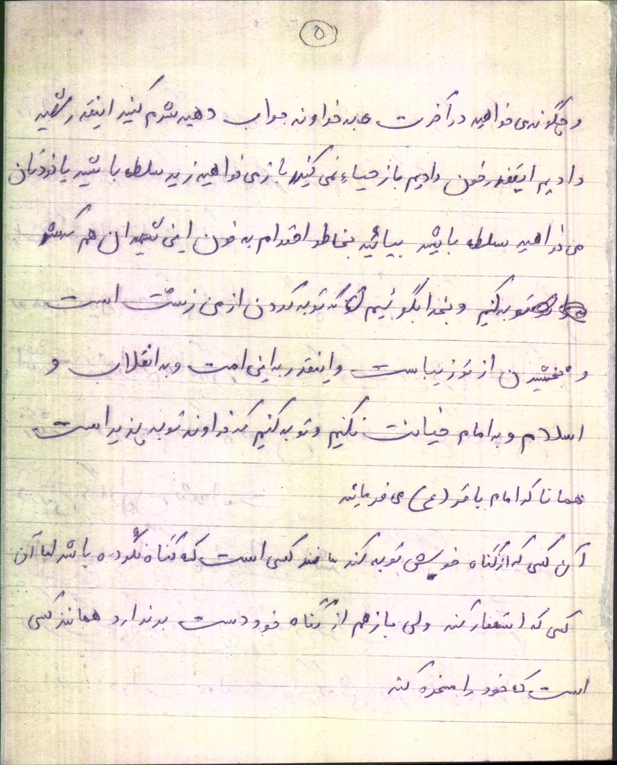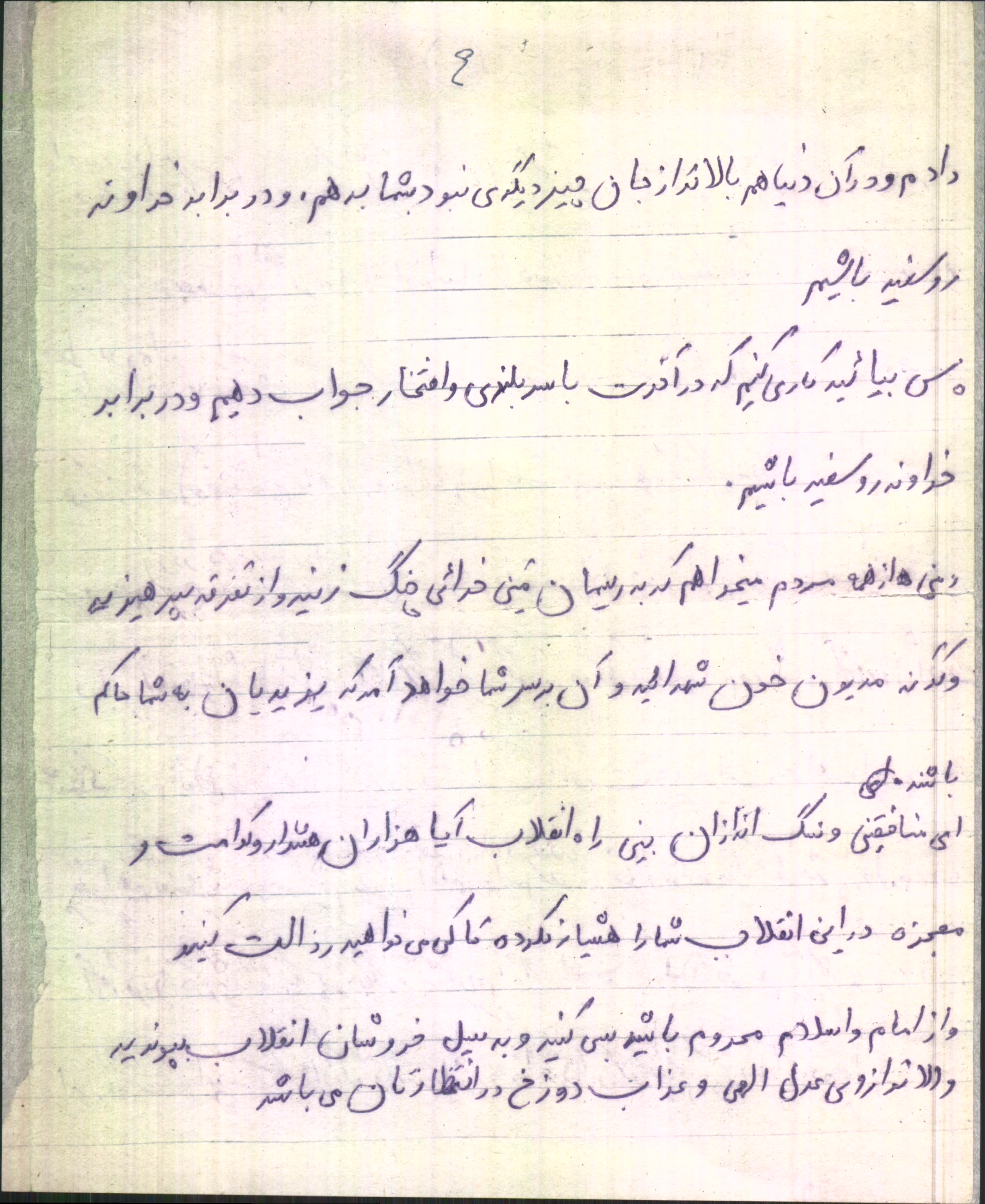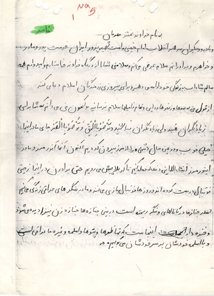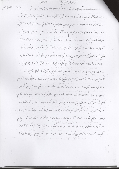 خدمت پدر و مادر عزیزم سلام عرض می کنم. و امیدوارم سالم و سلامت هم اکنون برای رزمندگان اسلام دعا میکنید از اینکه بدون اجازه آمدم خیلی معذرت می خواهم ولی خوب اگر می خواستم اجازه بگیرم می دانستم که نمیدهید پس بهتر دانستم بدون اجازه بیایم و واقعاْ به وجود ما در اینجا لازم است . به برادرانم محمد رضا , جبرئیل, فرهاد , رسول, رحیم و خواهرم فاطمه سلام می رسانم و سلامتی شما را از درگاه خداوند خواستارم .و امیدوارم که تعطیلات عید را به خوشی بگذرانید و انشاءالله آنطور که بویش می آید بزودی ما هم پیروز می شویم و خبر پیروزی را برایتان به ارمغان می آوریم خلاصه به تمام عموها و دایی ها و زن عموها و دوست و همسایه سلام برسانید در ضمن سهراب هم پیش ماست. و سلام عرض می کند و اکنون در شهر اهواز هستیم ولی آدرس دقیقی که شما برایمان نامه بنویسید نداریم. چون امروز به جبهه شوش می رویم. دیگر عرضی ندارم خداحافظ شما