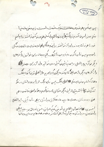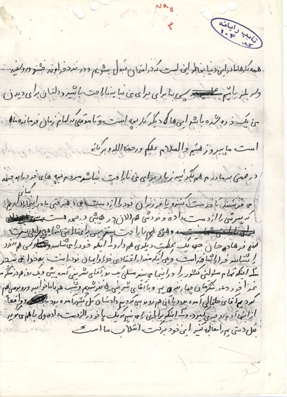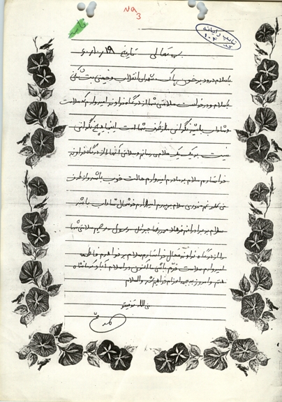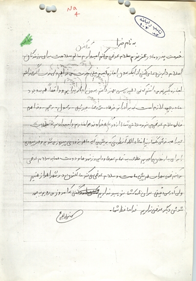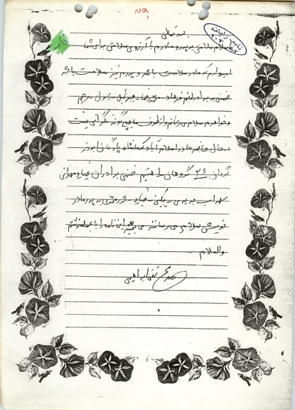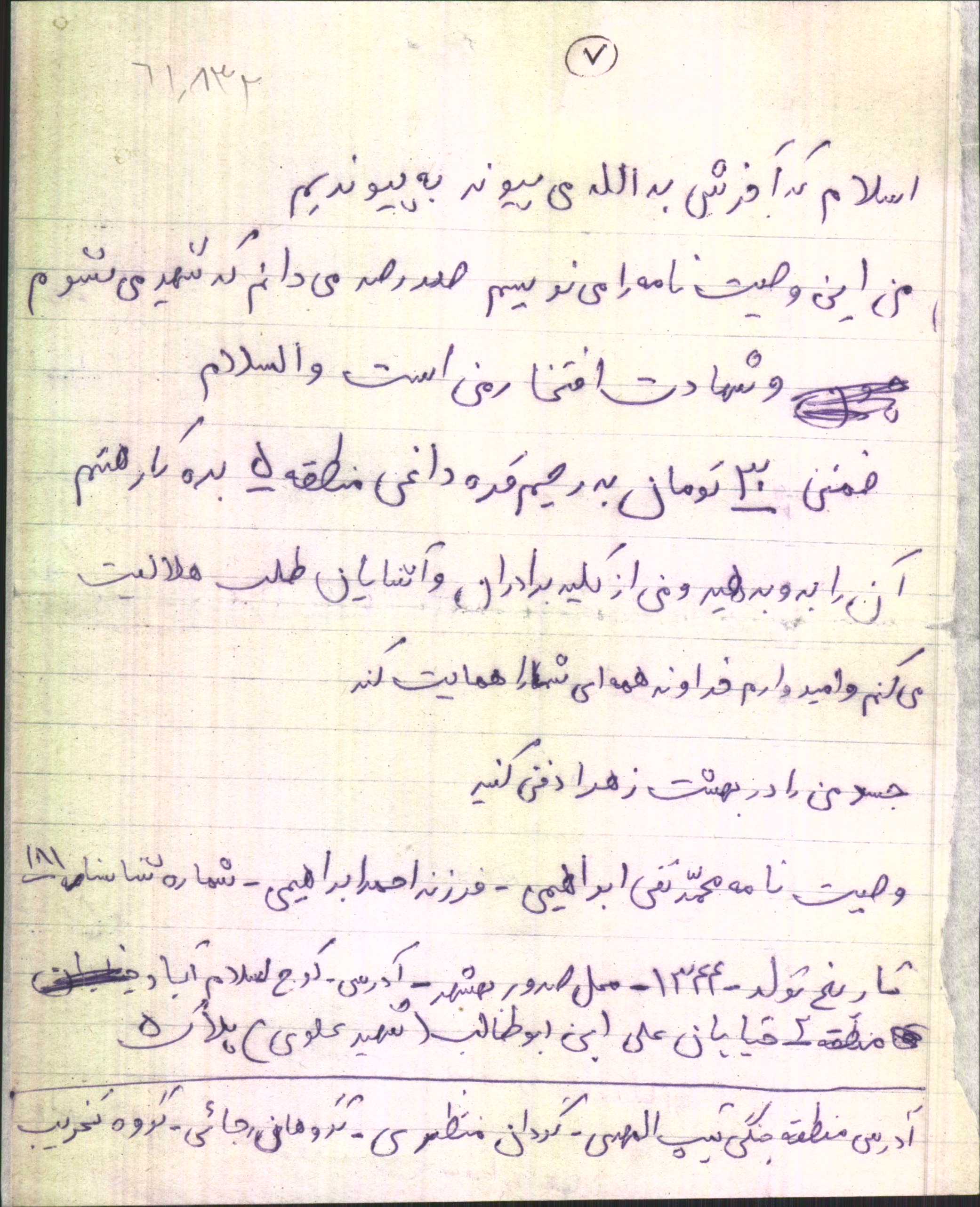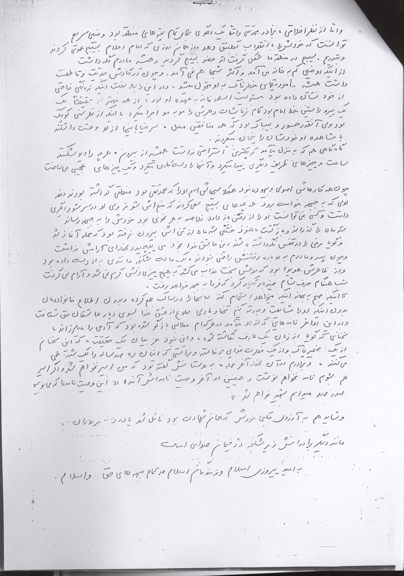 با سلام وسلامتی به پدر و مادرم با آرزوی سلامتی برای شما امیدوارم که مادر سلامت باشد و پدرم نیز سلامت باشد ودر ضمن به برادرانم فرهاد ، محمدرضا , جبرئیل, رسول و رحیم و خواهرم سلام می رسانم از طرف ما هیچگونه نگرانی نیست در حال حاضر ما اسلام آباد کرمانشاه پادگان ابوذر گردان 26 گروهان 4 هستیم ضمناْ برادران ضیاء مهرانی ، سهراب جدیدی و چگینی ضیاء و ثورمحمدی به پدر و مادر خویش سلام میرسانند میبخشید این نامه را با عجله نوشتم .