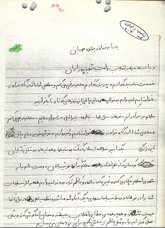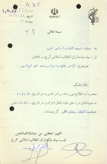 درود به رهبر انقلاب و امت شهید پرور ایران خدمت پدر و مادر بزرگوارم سلام عرض می کنم و سلامتی شما را از درگاه خداوند خواستارم وامیدوارم که بخوشی و دماغی چاق این روزهای کوتاه را بگذرانید . به برادرانم محمدرضا جبرئیل, فرهاد , رسول, رحیم و خواهرم فاطمه سلام عرض می کنم و سلامتی شما را از درگاه خداوند خواستارم و امیدوارم که بخوشی و دماغی چاق این زندگی را بگذرانید .خلاصه از سلام گذشته به همه فامیلها و همسایه ها و دوستان و آشنایان و کسانی که از قلم افتاده اند سلام مرا به آنها برسانید الان دوست دارم بدانم مشهدی اسلام چکار می کند و غیره که دنباله رو کاظم ترکه بودند امیدوارم همه بر اثر تبلیغات شما برادر فرهاد وتوسط تبلیغاتهای دیگر آگاه شده باشند ونقطه سیاهی در دل آنها درست نشود و همه و همه در خط این انقلاب بیفتند. و سخنان امام گوش کنند و به آن عمل کنند امیدوارم مثل کاظم ترکهاش نکنیم وبرای خودمان بتی بسازیم اکنون به ما گفته اند که سه روز استراحت کنیم و در یکی از ده های رقابیه شوش هستیم و بعد از آن انشاءالله کار صدام را یکسره می کنیم .